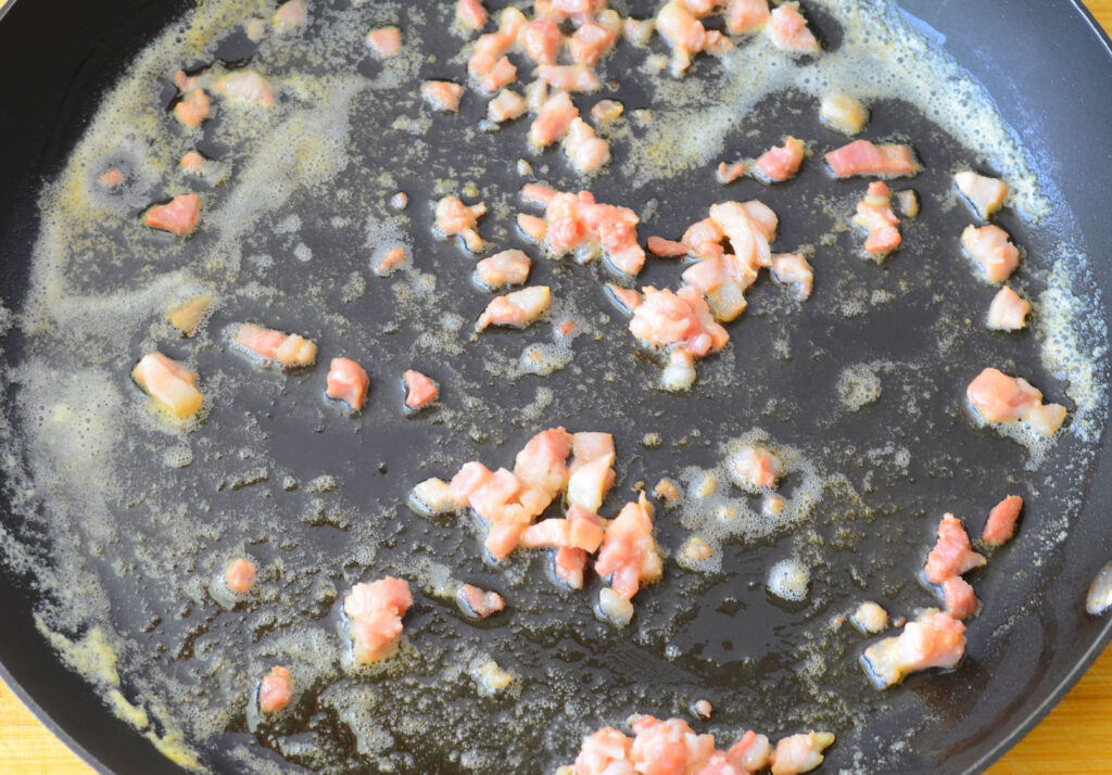 Step 2. Make the Cream Sauce: Using a deep skillet, over medium-high heat, melt the butter until it begins to foam. Add the pancetta and cook for 1 minute.
