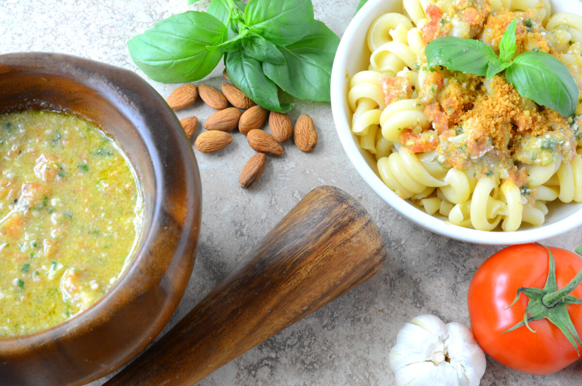 Sicilian pesto typically has basil, garlic, olive oil, and uncooked (crudo) tomatoes in it. The main difference between the traditional pesto and Pesto Trapanese is that it contains almonds. Sometimes mint, pine nuts, and anchovy are also added. Pesto Trapanese originated in the province of Trapani, an ancient seaport where …
