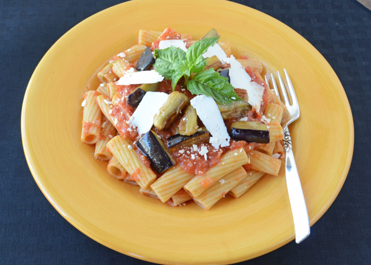 Pasta alla Norma is the simplest of pasta dishes. It starts with pasta and a basic tomato sauce that is topped with fried eggplant and grated Ricotta Salata cheese. The tomato sauce is what really makes this dish – use the best quality canned tomatoes. My preference is the San Marzano variety …